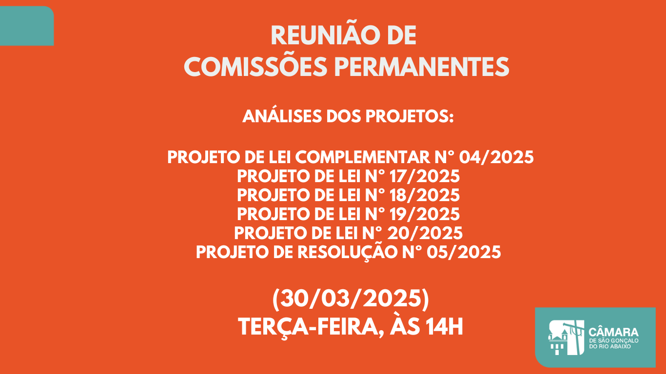 A Câmara Municipal de São Gonçalo do Rio Abaixo realizará nesta terça-feira, 30 de setembro, uma nova Reunião de Comissões. O encontro acontecerá a partir de 14h, no Plenário da Sede do Legislativo Municipal. Seis projetos foram lidos na última Reunião Ordinária e encaminhados para análises das Comissões Permanentes da Câmara. As pautas são: