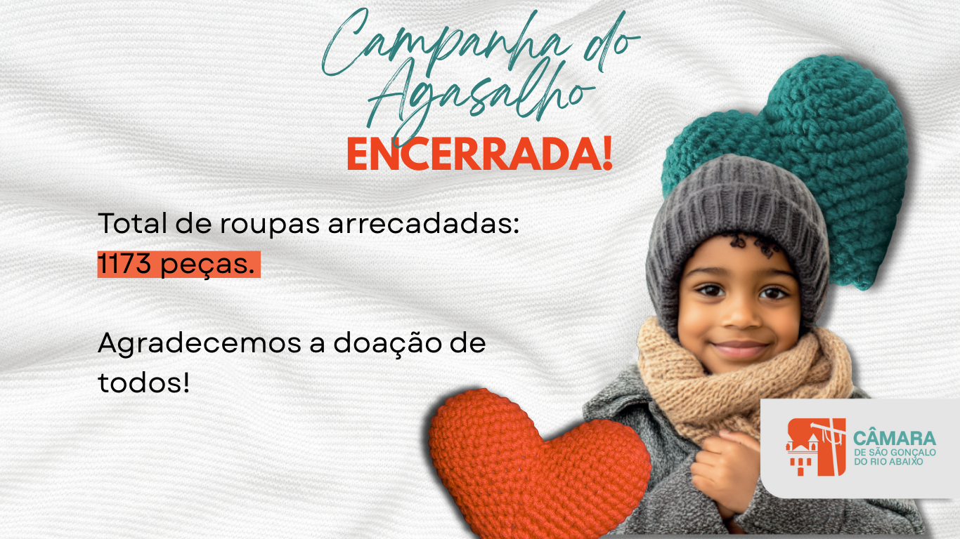 A Campanha do Agasalho é uma ação anual do Legislativo de Municipal, coordenada pela Escola do Legislativo e tem como meta amparar pessoas em vulnerabilidade social da cidade e da região, na estação mais fria do ano. A Câmara de São Gonçalo agradece a todos que se mobilizaram e contribuíram com as doações para aquecer o inverno de quem mais precisa.