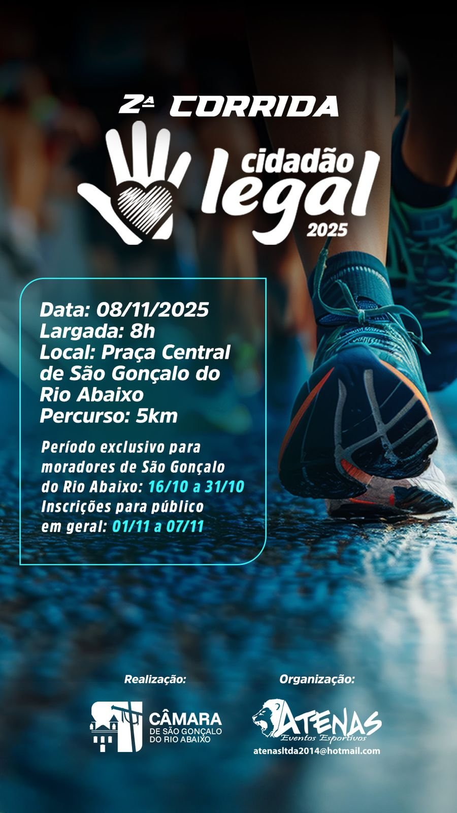 A Câmara Municipal de São Gonçalo do Rio Abaixo convida toda a população para participar da 2ª Corrida do Cidadão Legal, um evento que une esporte, saúde, bem-estar e conscientização cidadã. A atividade será realizada no próximo dia 8 de novembro a partir das 8h, com largada na Praça Central do município.